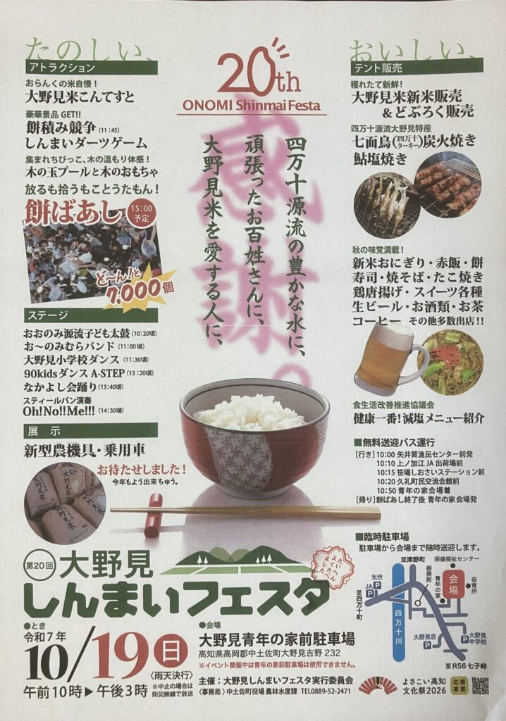 第20回大野見しんまいフェスタのご案内 2025年10月15日 イベント by nakatosa. 令和7年度大野見しんまいフェスタを10月19日(日)午前10時より、大野見青年の家前駐車場にて開催されます。 ステージで様々なイベントが開催される他、フェスタの最後、15時頃から7千個の餅ばあしが行われます。 お問い合わせは、主催である「大野見しんまいフェスタ実行委員会」(中土佐町農林水産課:0889-52-2471)までお願い致します。 Follow me! FacebooktwitterHatenaPocketCopy 前の記事