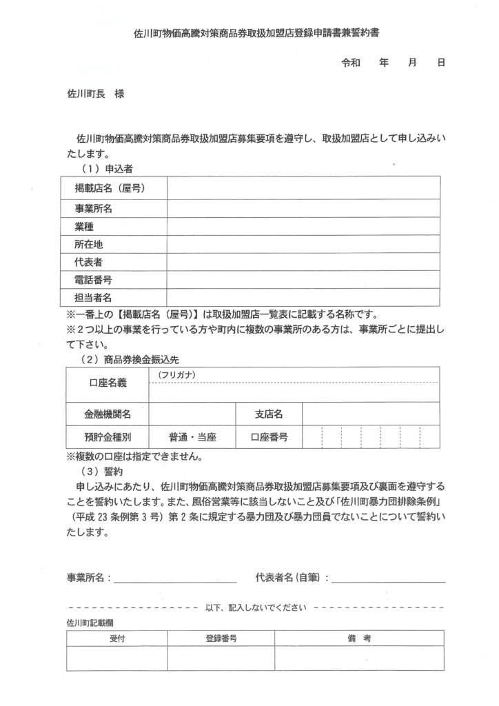 商品券取扱い加盟店への登録には必ず申請書を佐川町へ提出する必要があります。